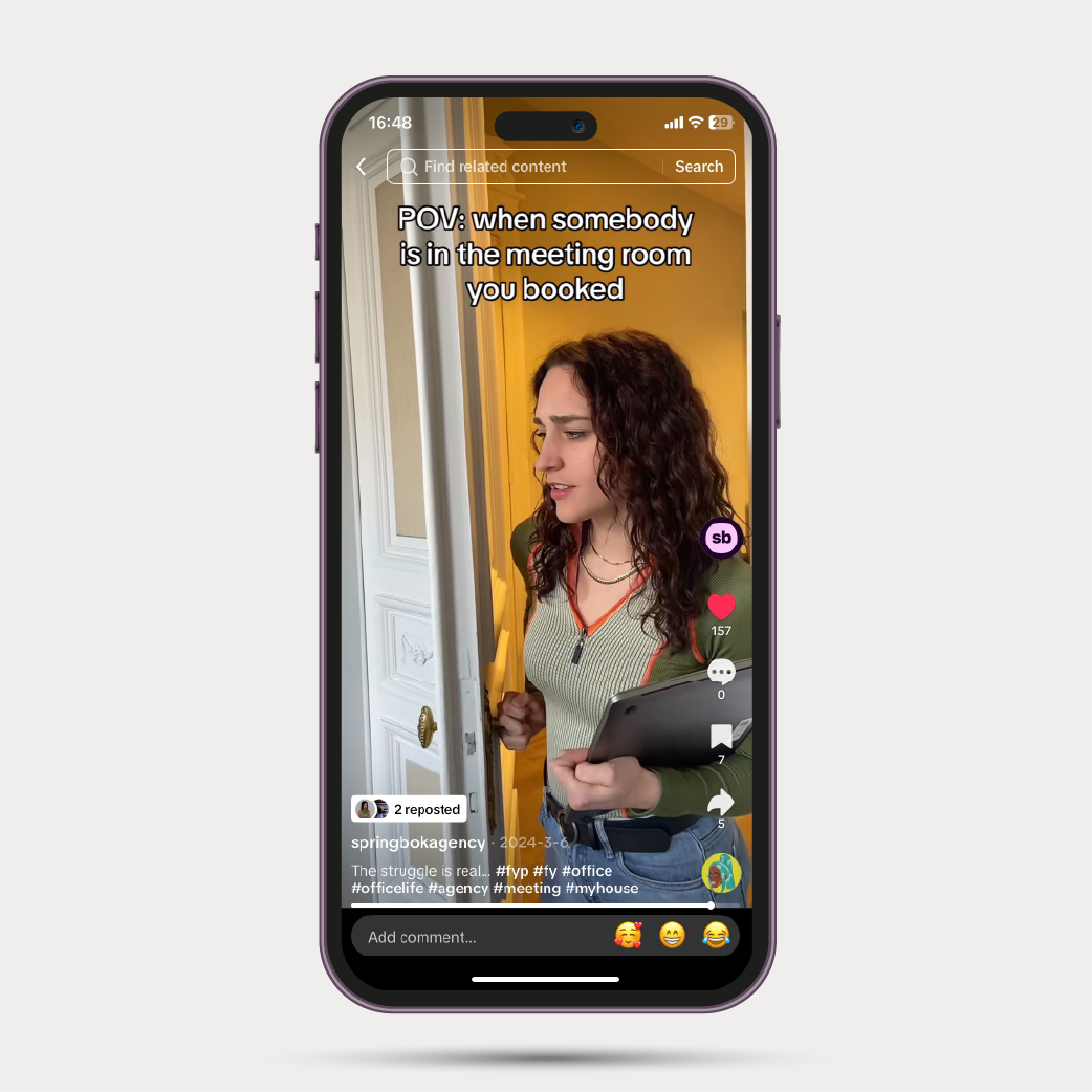 In my internship at Springbok Agency, me and another intern got the task to create TikTok videos. We used trends and hashtags to gain more views and likes. This was partially a study to see what shows at the For You page and what day and hour was beter to post on.